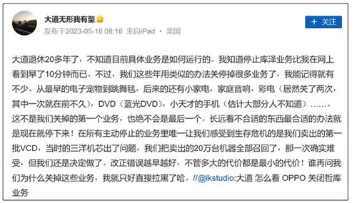 5月16日,當再次被問及如何看待“OPPO關(guān)閉哲庫業(yè)務(wù)”一事時,步步高創(chuàng)始人、OPPO背后的男人段永平在雪球平臺上說道。就在幾天前,他剛就哲庫關(guān)停一事表達過類似觀點。