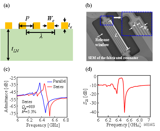 A3超高頻高耦合聲波諧振器 (a)諧振器SEM圖像,(b)諧振器測試導(dǎo)納曲線