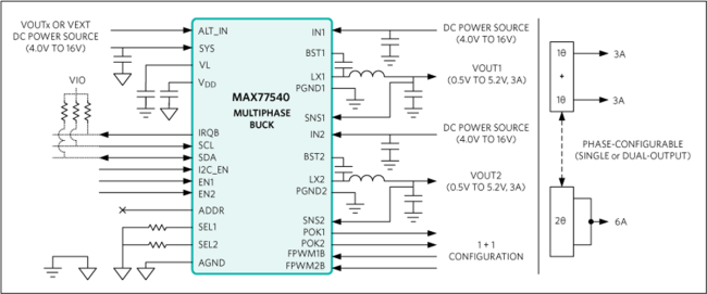 兩個3A降壓轉換器(1Φ)或一個6A降壓轉換器(2Φ)