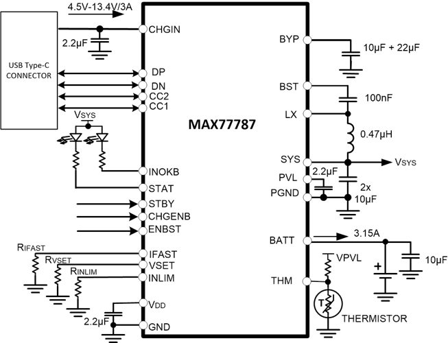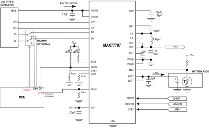MAXIM美信公司生產的MAX77787是一款集成USB Type-C?CC檢測和反向升壓功能的獨立3.15A充電器。通過電阻可輕松配置快速充電電流和端接電壓。該IC的輸入電壓范圍為4.5V至13.4V,最大輸入限流為3A。該IC還實現了自適應輸入電流限制(AICL)功能,通過降低輸入電流來調節輸入電壓,以防止薄弱的適配器出現電壓崩潰或折返。
