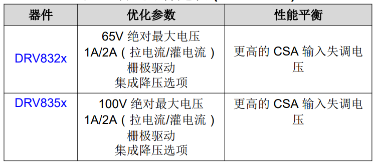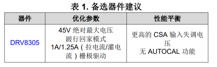 備選器件建議 根據(jù)必要的系統(tǒng)要求,還可通過其他器件提供所需的性 能和功能。對于需要詳細(xì)診斷和跛行回家模式支持的應(yīng) 用,建議使用 DRV8305。在需要更高工作電壓(例如 由 36V 電池供電)的應(yīng)用中,宜選擇 DRV832x。
