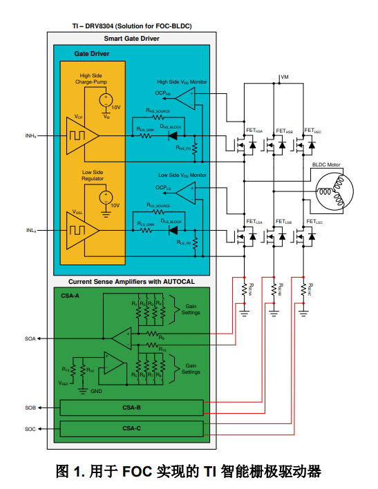 三相 BLDC 電機(jī)需要一個(gè)三相電壓源逆變器 (VSI) 為 電機(jī)提供交流電流。該 VSI 的開關(guān)通常采用由柵極驅(qū) 動器驅(qū)動、適用于低壓應(yīng)用的場效應(yīng)晶體管 (FET),或適用于高功率應(yīng)用的絕緣柵雙極晶體管 (IGBT)。當(dāng)今 大多數(shù)可用的柵極驅(qū)動器都需要使用外部柵極元件(電 阻和齊納二極管)來進(jìn)行操作和提供保護(hù)。但是,采用 TI 的智能柵極驅(qū)動 (SGD) 技術(shù)后則無需使用外部柵極 原件,如圖 1 中所示。借助其可調(diào)節(jié)柵極驅(qū)動電流 (柵極壓擺率控制),SGD 架構(gòu)可靈活地減少電磁干 擾 (EMI)。SGD 架構(gòu)可優(yōu)化死區(qū)時(shí)間,提高效率,同時(shí)充分保護(hù) FET 免遭擊穿,還添加了強(qiáng)下拉電流來防 止任何雜散 dv/dt 柵極導(dǎo)通。